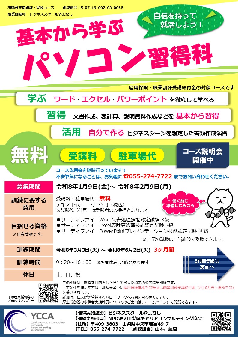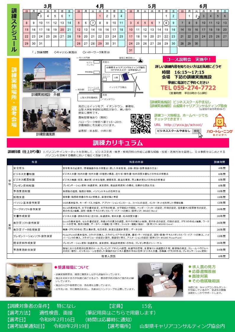 職業訓練校ビジネススクールやまなしでは、ハロートレーニング(山梨県求職者支援訓練、山梨県離転職者訓練)を実施しております。