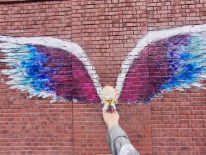 しばらく歩いていると、赤レンガ倉庫の近くのお店で壁に描かれている羽を発見!