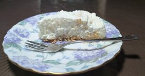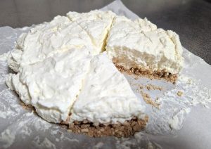 今回作ったのは下の生地をビスケットを砕いた生地で、チーズケーキはクリームチーズと生クリームを合わせた甘さ控えめのものにしました。まず、ビスケットですが分量通りにしたはずがまとまりが悪く、ほろほろと崩れぎみな生地になりました。続いてチーズの部分ですがゼラチンで固めるのですが、レシピは粉ゼラチンで売っていなかったので板ゼラチンを使ったところ、1度は液体状に溶けたのですが、チーズの生地と混ぜた瞬間にゼラチンが固まりグミのような小さな塊が所々にできてしまいました。味はおいしく出来たのですが、ゼラチンが変に固まり触感がよくない仕上がりになりました。